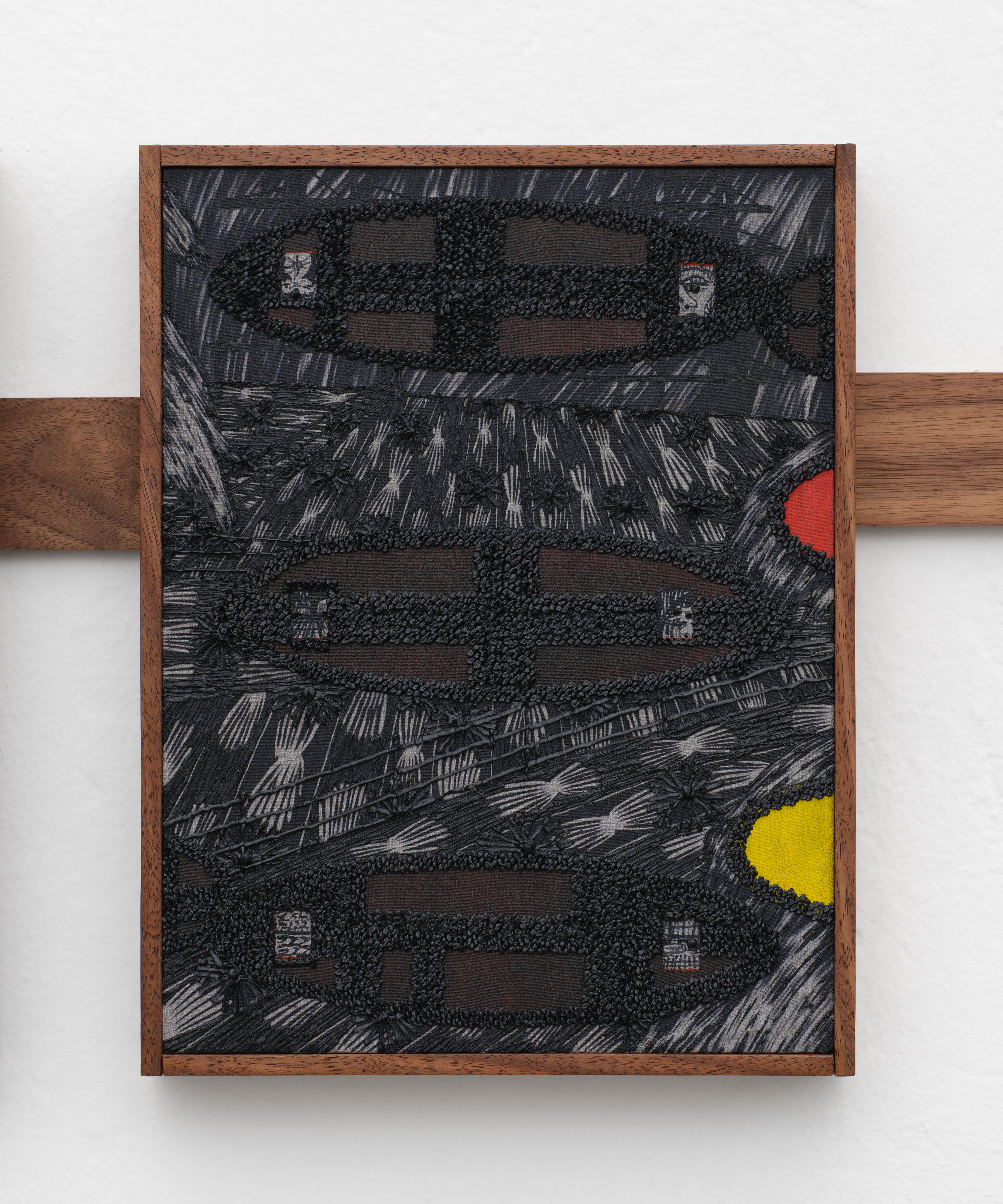The line of wainscotting wrapping the gallery instills a cold illusion of domesticity in the white walled space. Rigid, pious, sterile, and neat, this furnishing embellishes the body of work with a minimalistic beauty in its craftsmanship.