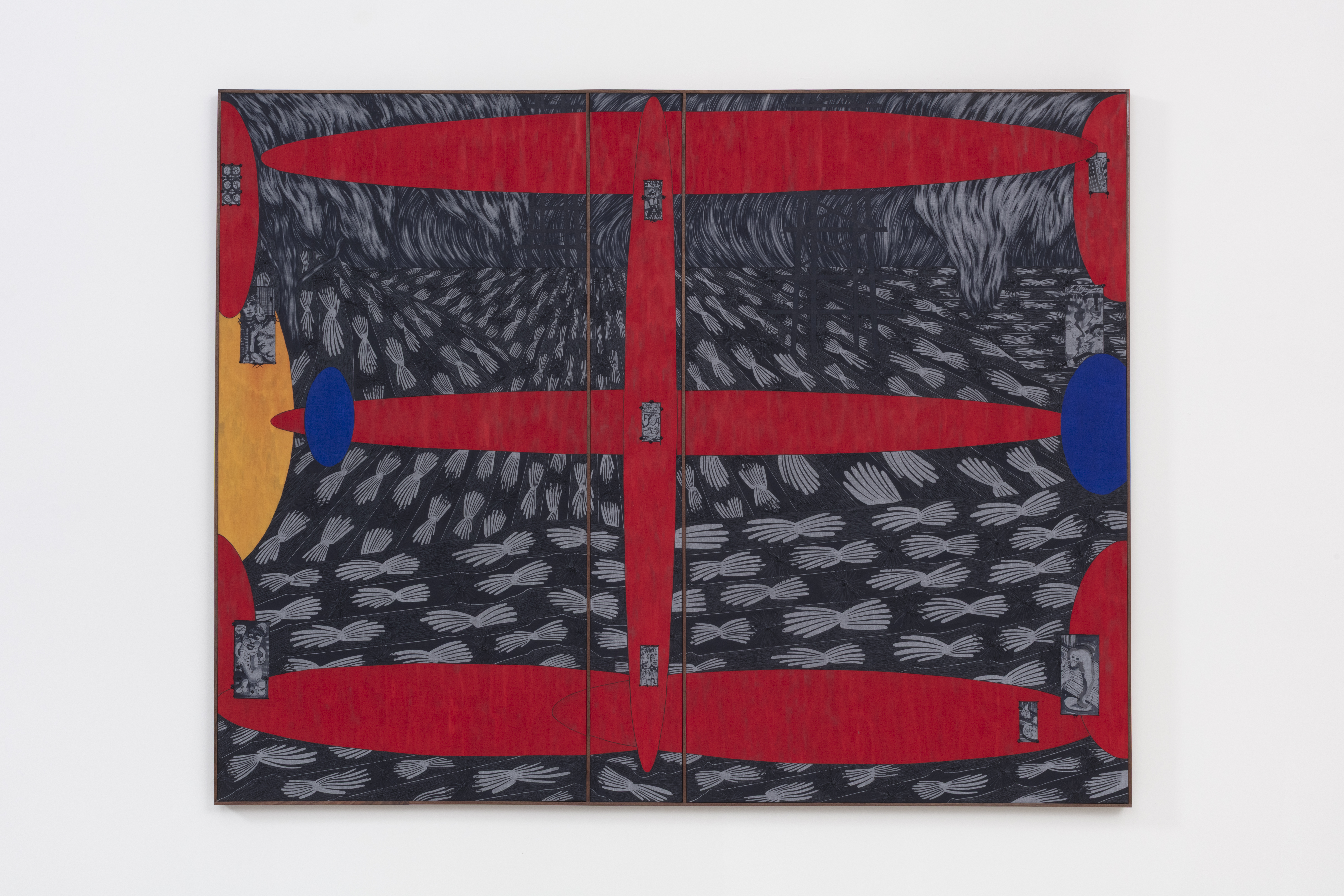 Cook translates these historical conditions into a pictorial language grounded in rhythm and structural order. Textured fields of oil paint are organized into linear formations, creating the base architecture of the compositions. In works such as Combine III (2025), repeating floral elements extend across the surface in what the artist has described as an “exercise in tedium,” invoking both labor and continuity. At times, these forms verge on the cellular, suggesting that the pressures of infrastructure register not only across the landscape, but within the body.